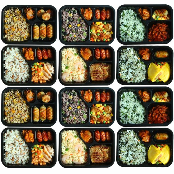 이 사진으로 예시로 들어보자면... 기본적으로 밥, 김치, 소시지, 기타 반찬이 들어있다.