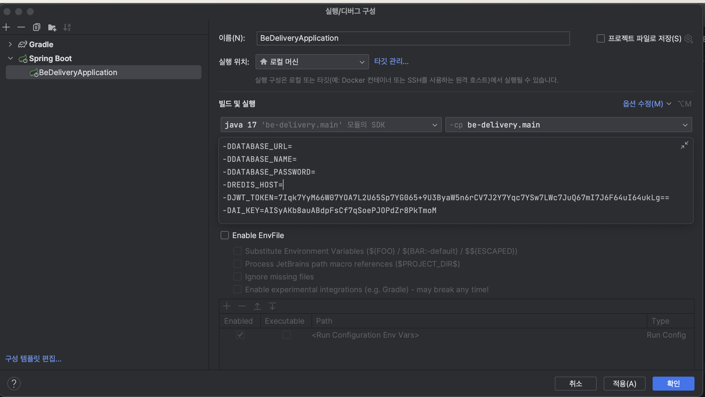 그래서 일단 환경변수를 jar파일말때 하기로 했다. 뭐 배포는 내가 하니..ㅎㅎ;