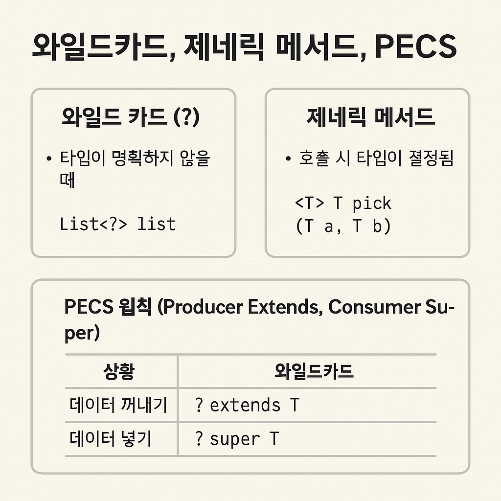 와일드카드는 타입을 명확히 알 수 없을 때 유용하고, PECS 원칙에 따라