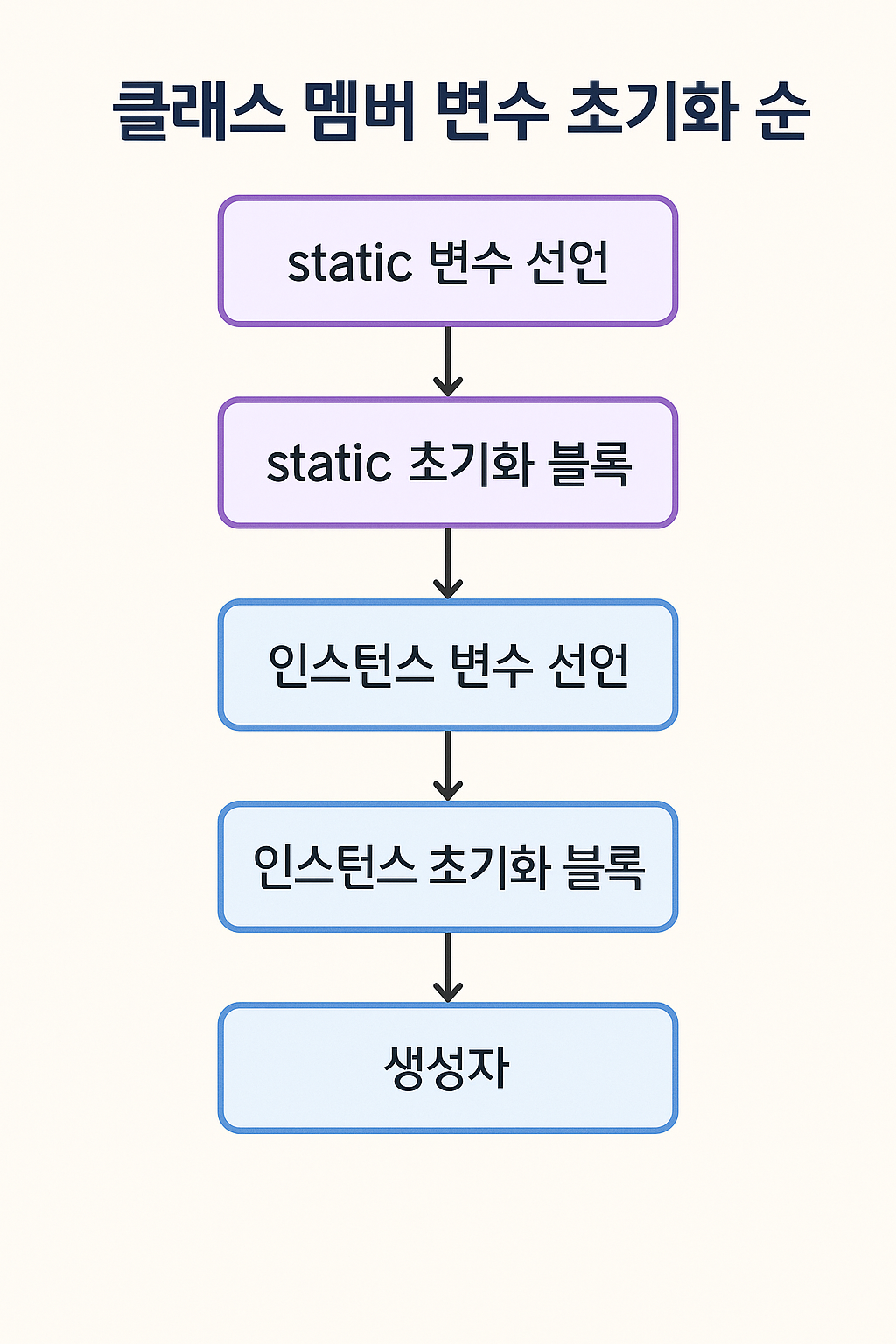 순서는 static 변수 선언 → static 초기화 블록 순서대로 실행됩니다. - 인스턴스 변수는 객체가 생성될 때마다 초기화되고,