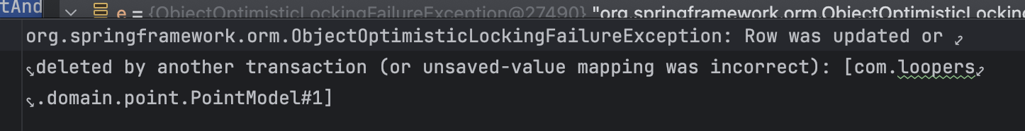 이제 애플리케이션은 version이라는 값을 통해 락을 걸 수 있게 되었다. version도 DB의 칼럼이기 때문에 데이터의 주체는 DB이기 때문에 DB에서는 수많은 충돌이 발생활 거고 원하지 않는 결과를 리턴이 된다. 그래서 version이라는 칼럼으로 이 사태를 수습을 하려고 한 건데 문제는 version도 완벽하지는 않아서 버전이 존재한다고 해서 충돌이 안 생긴다는 보장을 할 수가 없다. 그렇기 때문에 낙관락을 사용하여도 충돌이 발생할 수밖에 없다. 그렇다는 건 충돌이 발생하여도 처리할 수 있는 방법을 생각해야 한다.