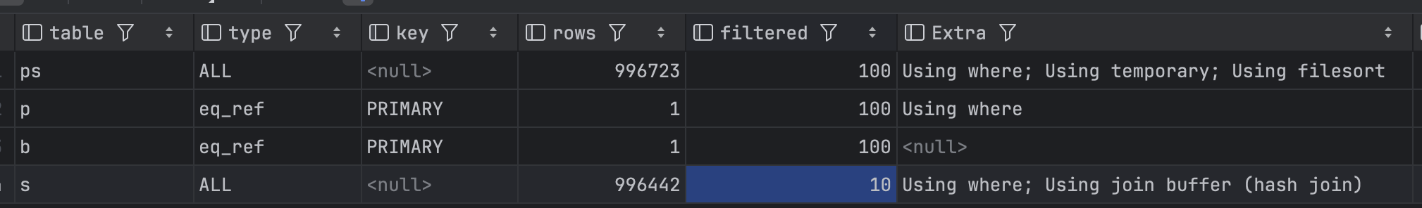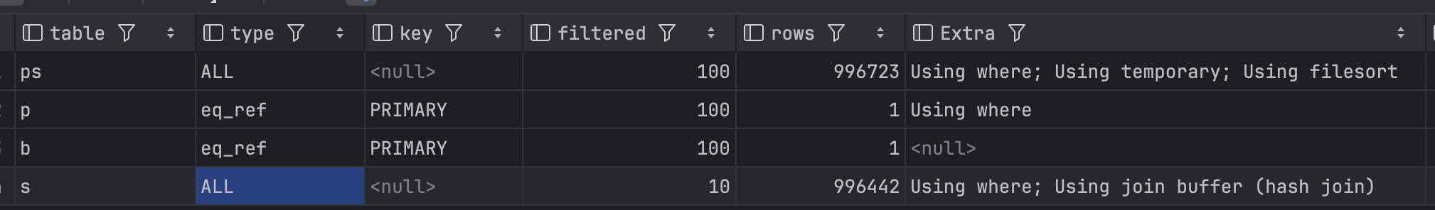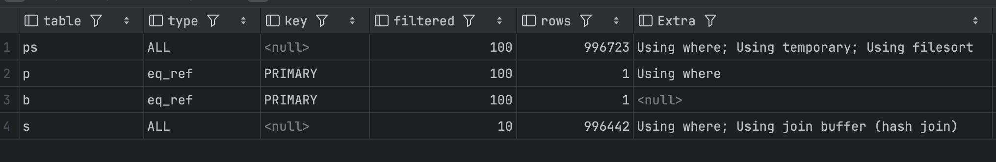- eq_ref: JOIN에서 PRIMARY KEY나 UNIQUE KEY를 사용해 다른 테이블의 특정 행을 찾는 경우. 제공해주신 이미지의 3행에 해당하며, 조인에서 매우 효율적인 방식