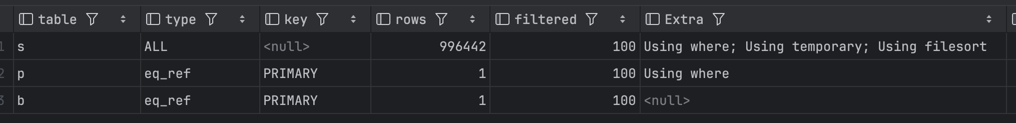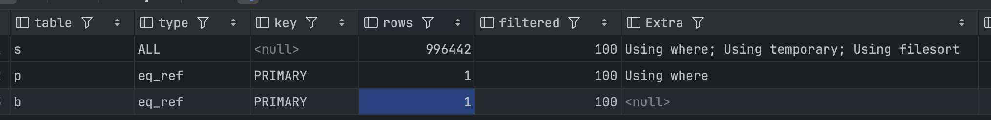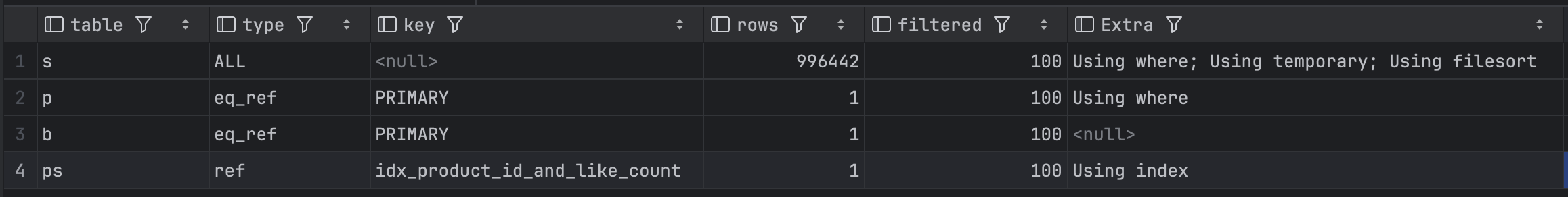 특히, stock, prdocut_satate의 예측 스캔수가 99만이 된다. 이는 엄청난 성능이 감소가 된것을 확인 할 수가 있다.