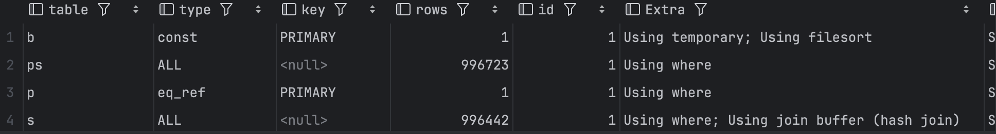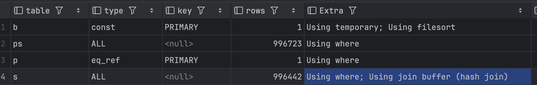 위에서 4건인 경우에 상품의 예상 row수는 1로 나왔다. 이는 상품에는 성능 저하가 심하지 않다는 뜻으로 해석이 되어진다.