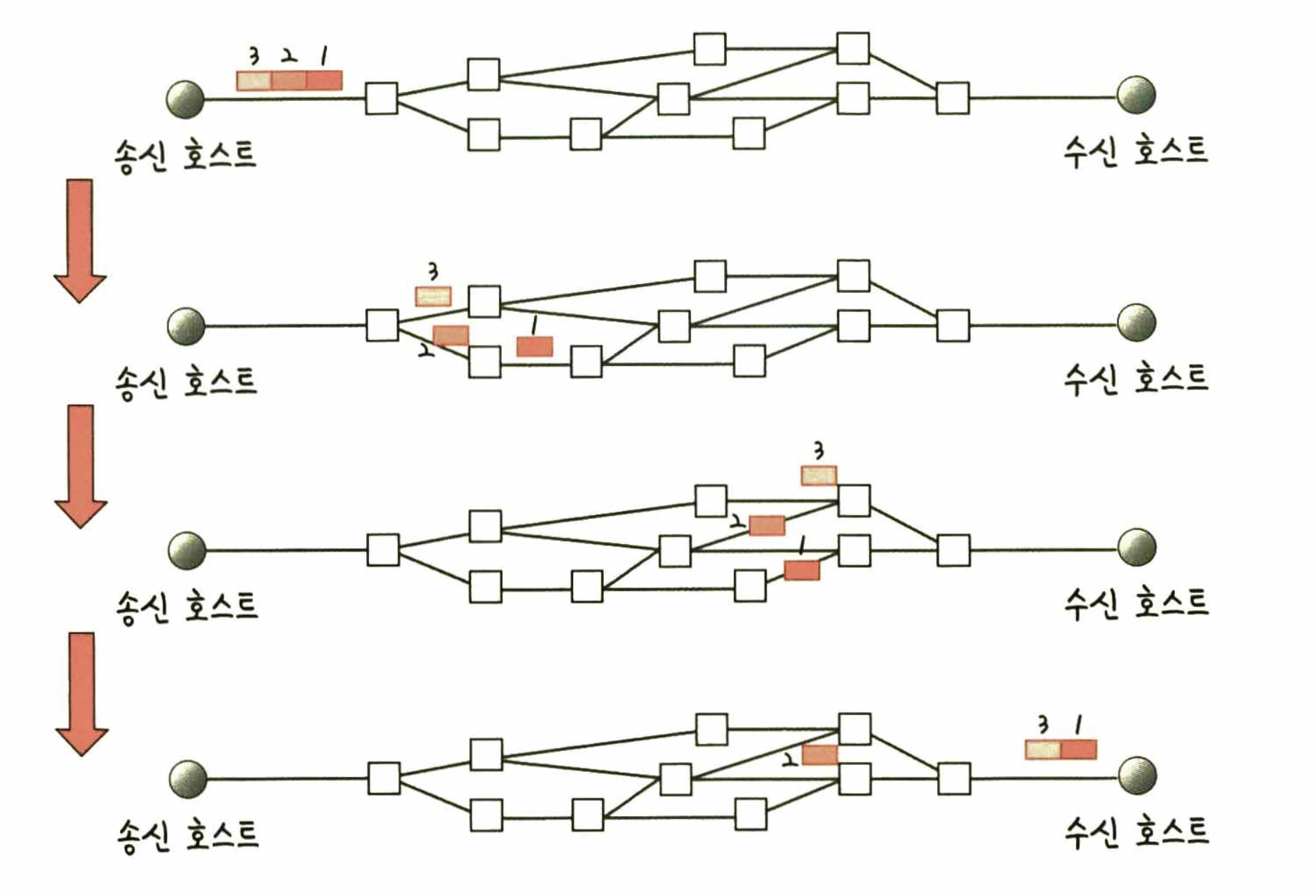 이 방식은 각 패킷이 독립적으로 처리되어 목적지까지 도달하는 방식을 말합니다. 결국, 각자 알아서 목적지까지 전송이 되어진다는걸로 이해할 수 있을거 같습니다. 순서 또한 보장하지 못해 특정 데이터를 전송한다고 가정했을때 온전한 데이터로 전송이 되어진다고 장담할 수 없을 거 같습니다. 다음처럼 동작이 된다고 합니다.