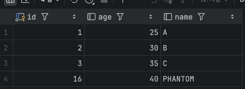 같은 트랜잭션 내에서 동일한 조건으로 두 번 SELECT를 했을 때, 첫 번째 조회에는 없던 새로운 행이 두 번째 조회에서 나타나는 현상을 말합니다. 즉, non Repeatable Read가 행의 값이 바뀌는 문제라면 phantom Read는 행의 개수가 바뀌는 문제입니다.