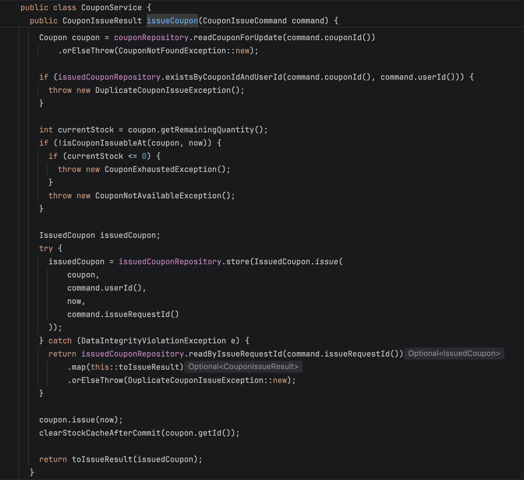 현재는 트랜잭션 전파 방식을 사용해 별도의 트랜잭션을 생성하도록 구현했습니다. 다만 이 부분은 Spring Event 기반으로 분리해도 충분히 가능하다고 생각합니다. 그리고 해당 로직은 비동기로 처리해야 의미가 있는데, @Async가 적용되지 않으면 결국 동기적으로 실행됩니다. 이 경우 쿠폰 생성 이후 발행까지의 지연 시간이 예상보다 훨씬 커질 수 있습니다.