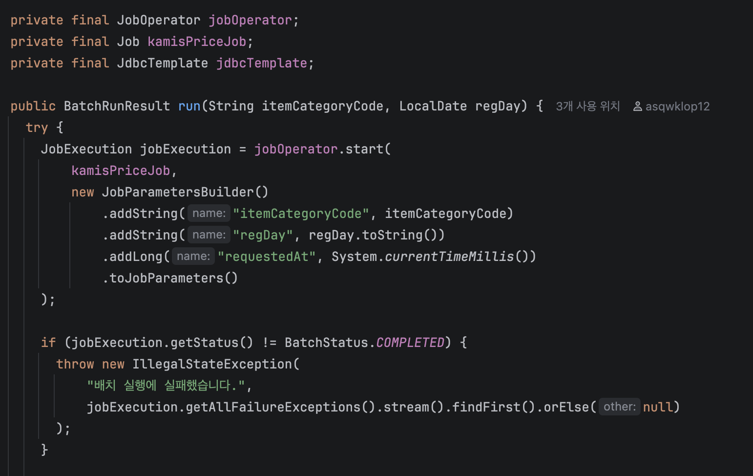 다시 말해, 이 코드는 스프링이 관리하는 배치 코드라기보다는, 배치와 비슷한 흐름을 직접 구현한 코드에 가깝다.