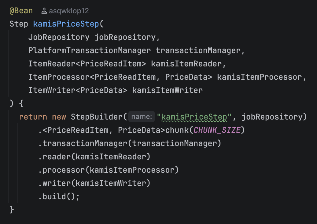 현재는 배치의 모든 과정을 하나의 Step으로 만들었기때문에 Job에 들어가는 Step하나 뿐이다.