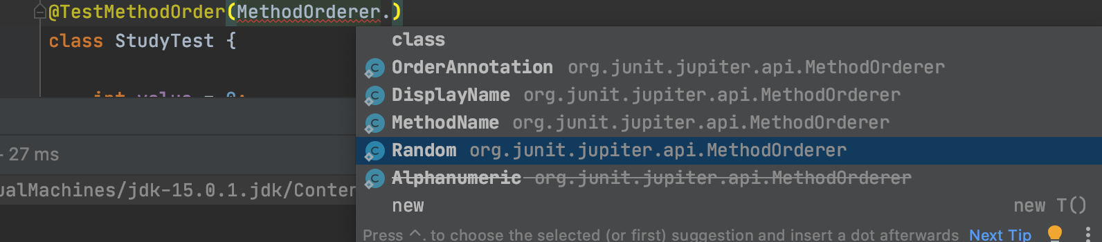 @TestMethodOrder 어노테이션으로 설정할 수 있는데 다음과 같이 추가할 수 있다.