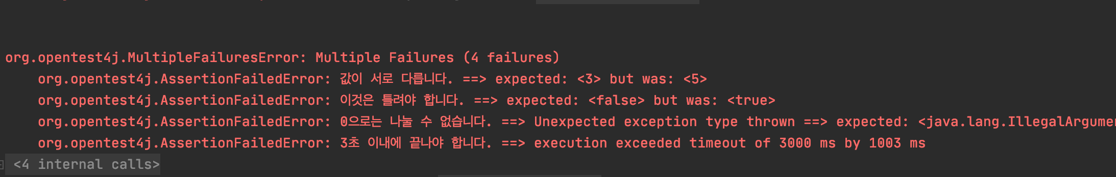 assertAll(() -> assertEquals(3, 5, "값이 서로 다릅니다."),